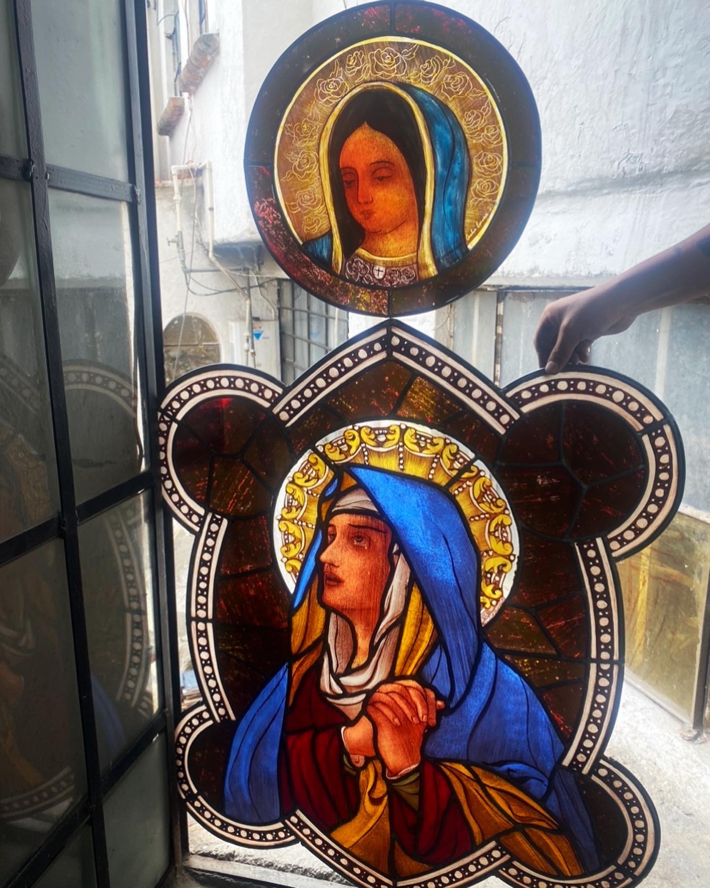 Imagen de una pintura de una figura religiosa femenina con un halo dorado rodeada de estrellas blancas, colocada sobre una ventana
