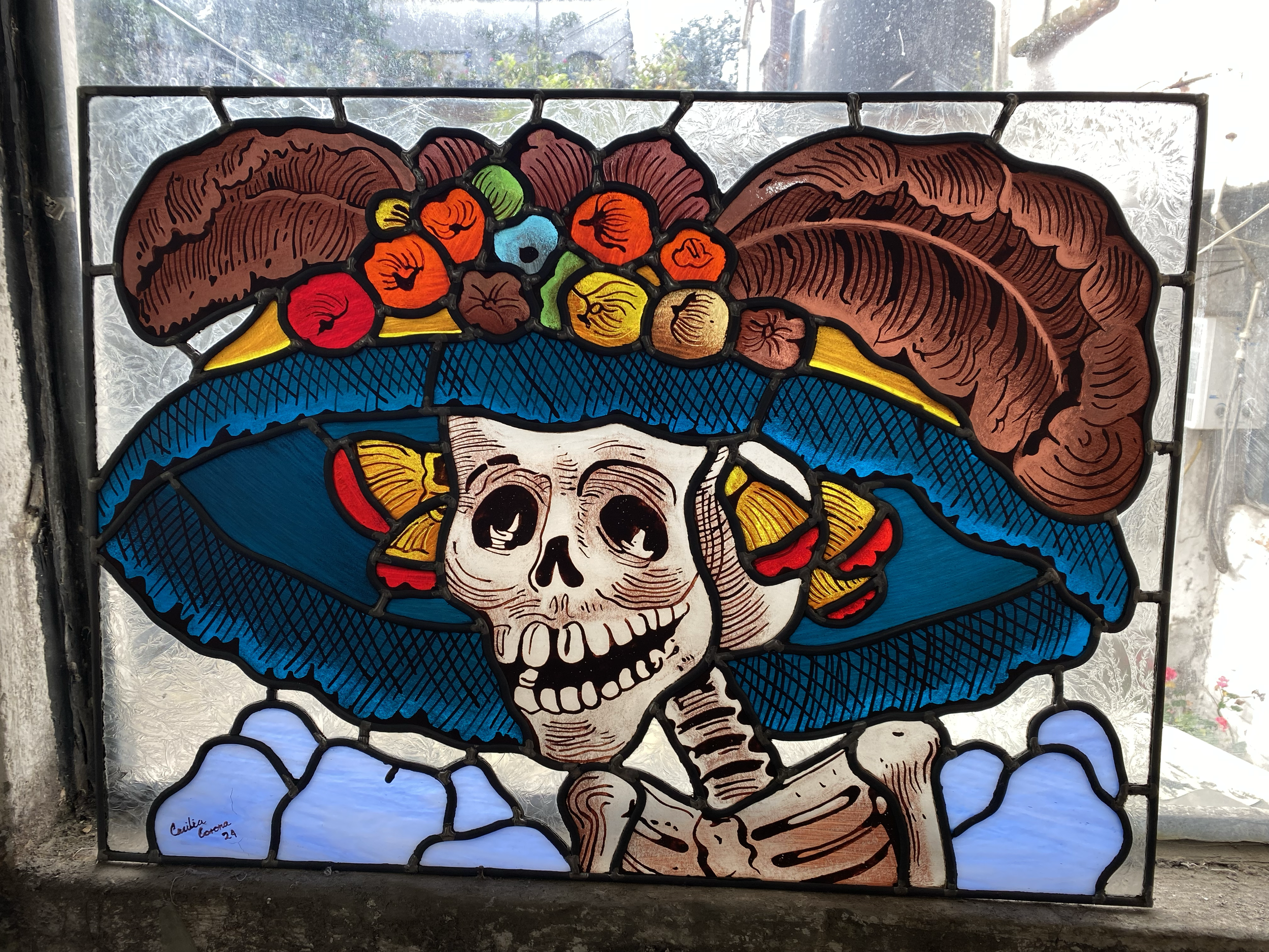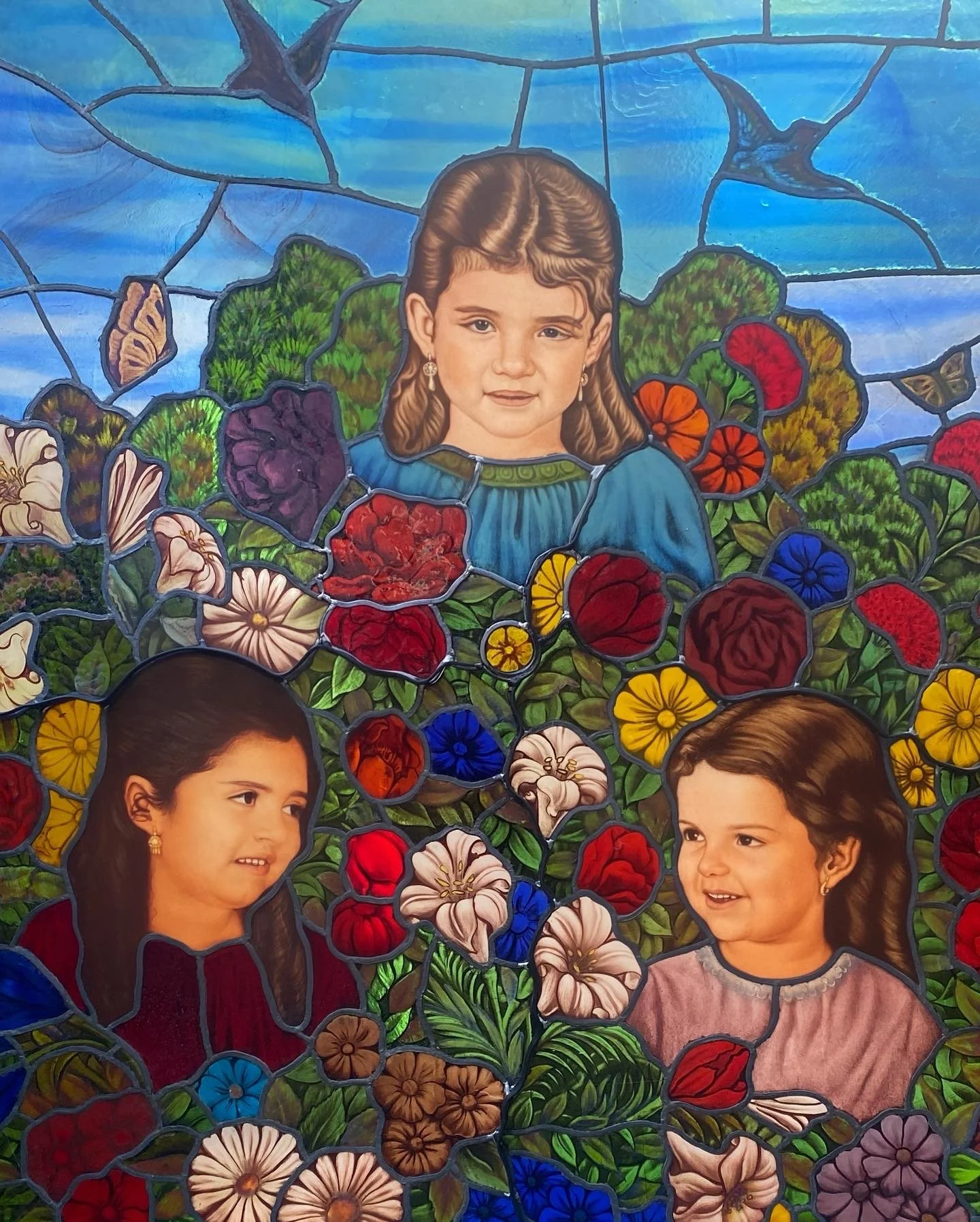 Vidriera con retrato de una persona con cabello oscuro y sonrisa, vestida con ropa en tonos rojos, verdes y azules, en un entorno urbano con ventanas y edificios en el fondo.