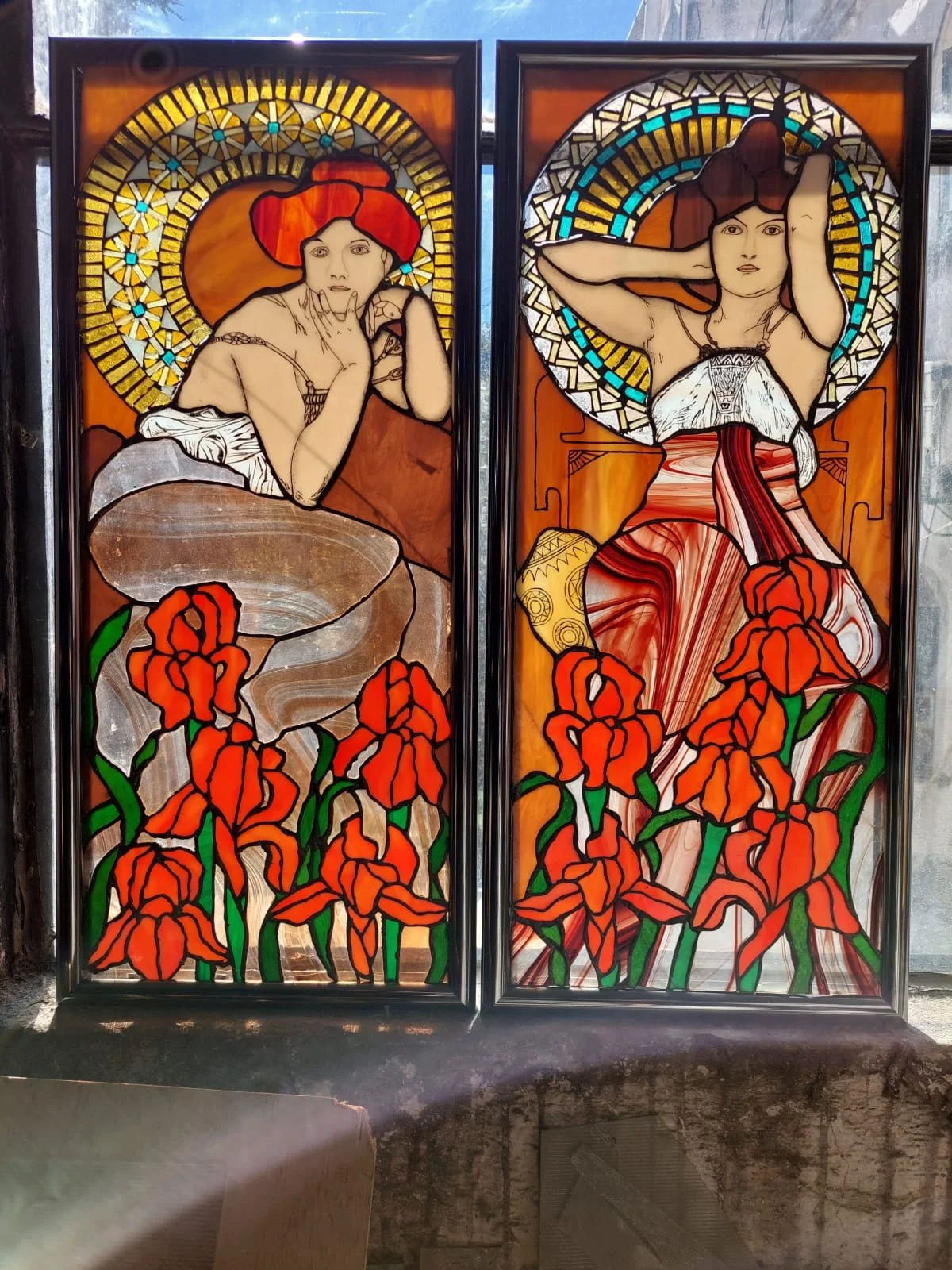 Vidriera con una figura de una mujer, parcialmente desnuda, con un pañuelo rojo, sosteniendo un tilar en su hombro y rodeada de hojas y uvas