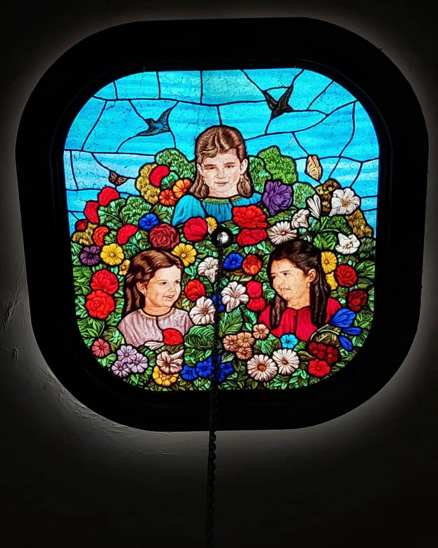 Vitral con imagen de una ave, un círculo central con símbolos religiosos y una inscripción que dice "San Lázaro D.F. 1981".
