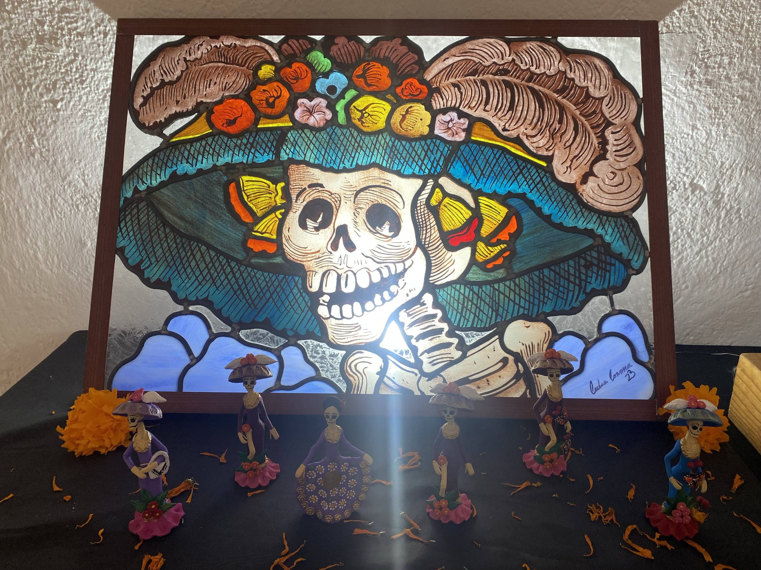 Pieza de arte en vidrio con figura de un ángel tocando una trompeta, decorada con colores cálidos y fríos, en un taller de arte.