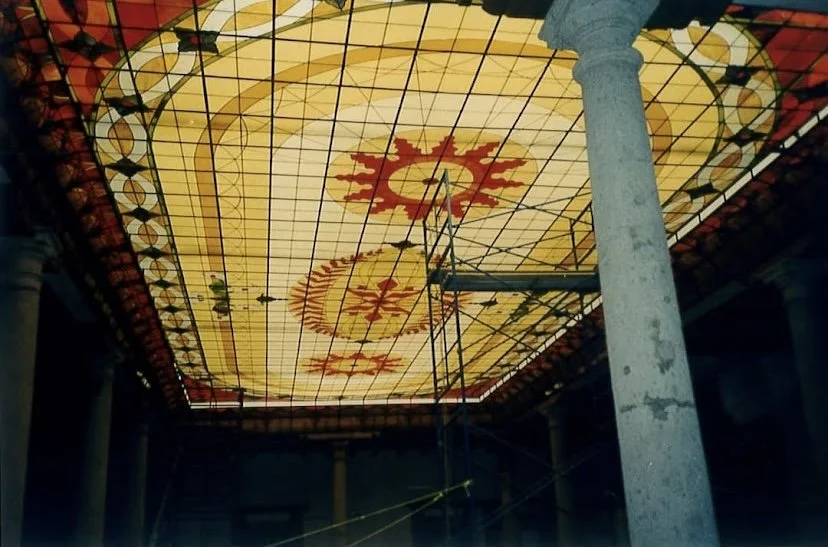 Vitrales decorativos en el techo con patrones coloridos en tonos azules, verdes, rojos y amarillos, con detalles florales y geométricos.